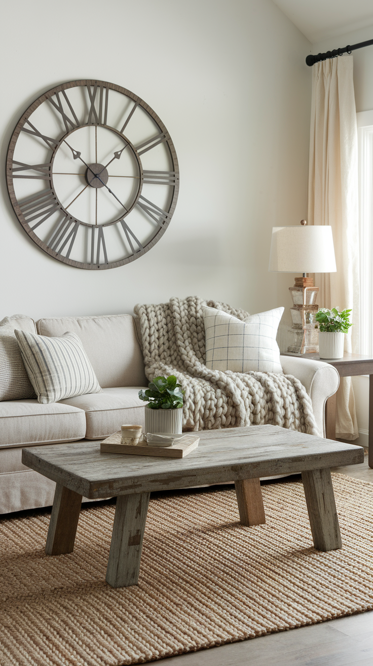 Neutral color palette – Whites, creams, and soft grays with warm undertones. Ever noticed how every farmhouse living room looks bright and welcoming? Yep, that’s why.