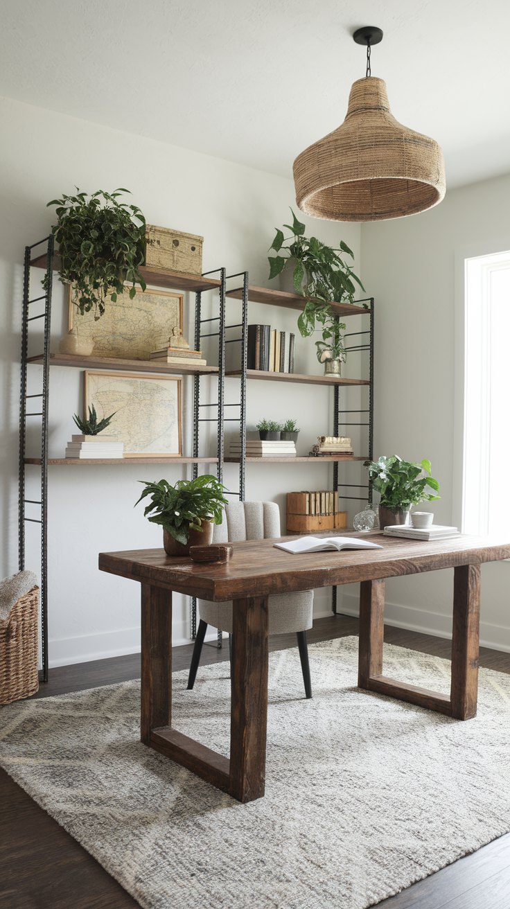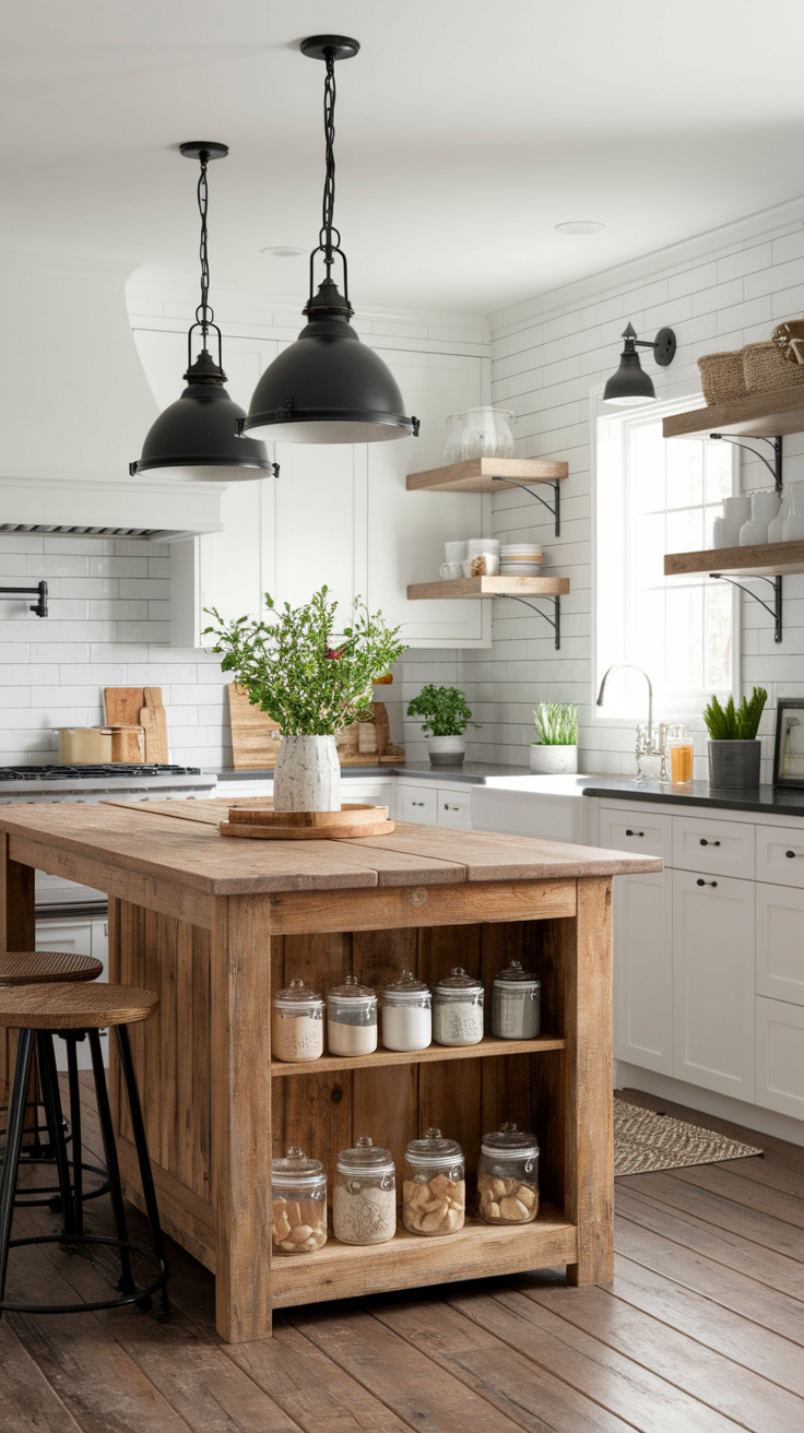 Open shelving for décor + storage – Mix books, plants, and rustic accents.