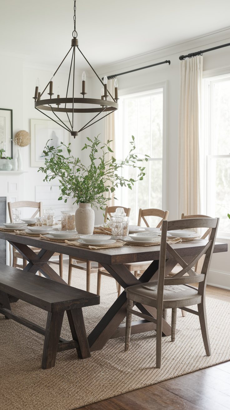 Mix-and-match chairs – Pair a long bench on one side with mismatched wooden chairs. Trust me, it looks intentional, not messy.