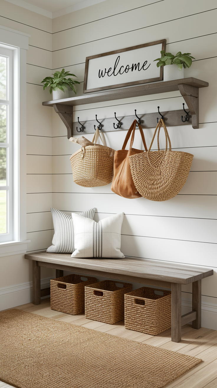 Use a sturdy bench or reclaimed wood hooks for practical storage.