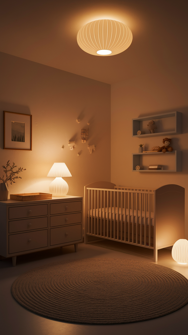 Lighting in nurseries matters way more than most people realize. Trust me, you don’t want to deal with bright overhead lighting at 2 a.m. when you’re half asleep.