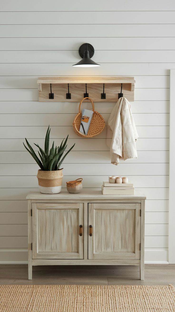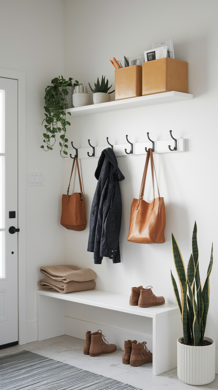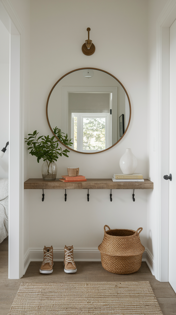 Maximize vertical space with wall hooks and floating shelves to keep your tiny entryway organized without sacrificing floor space.