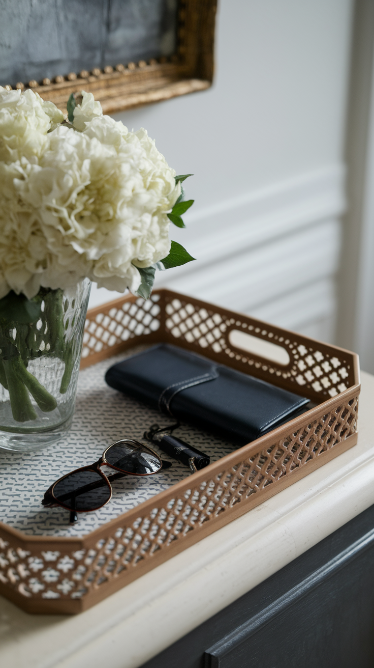 Put a small tray or bowl by the door for keys, wallets, and random receipts. Trays and bowls are also perfect for organizing small items and other small items like loose change, sunglasses, or earbuds, keeping everything in one place. Suddenly, you’re not spending 20 minutes searching for car keys while questioning your life choices, and your entryway stays neat.