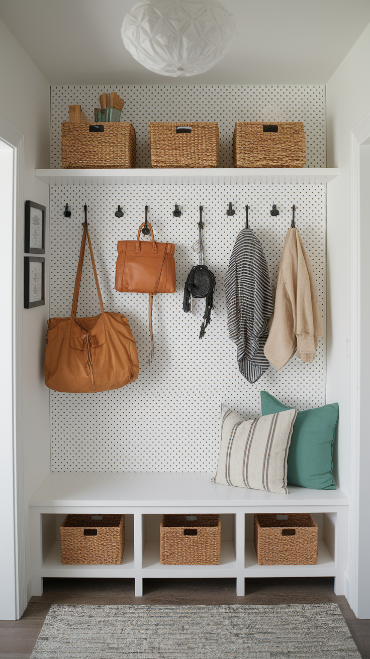 A pegboard in your entryway = customizable storage on steroids. Pegboards are one of the smart ideas for entryway storage, offering a practical and innovative way to organize your space.