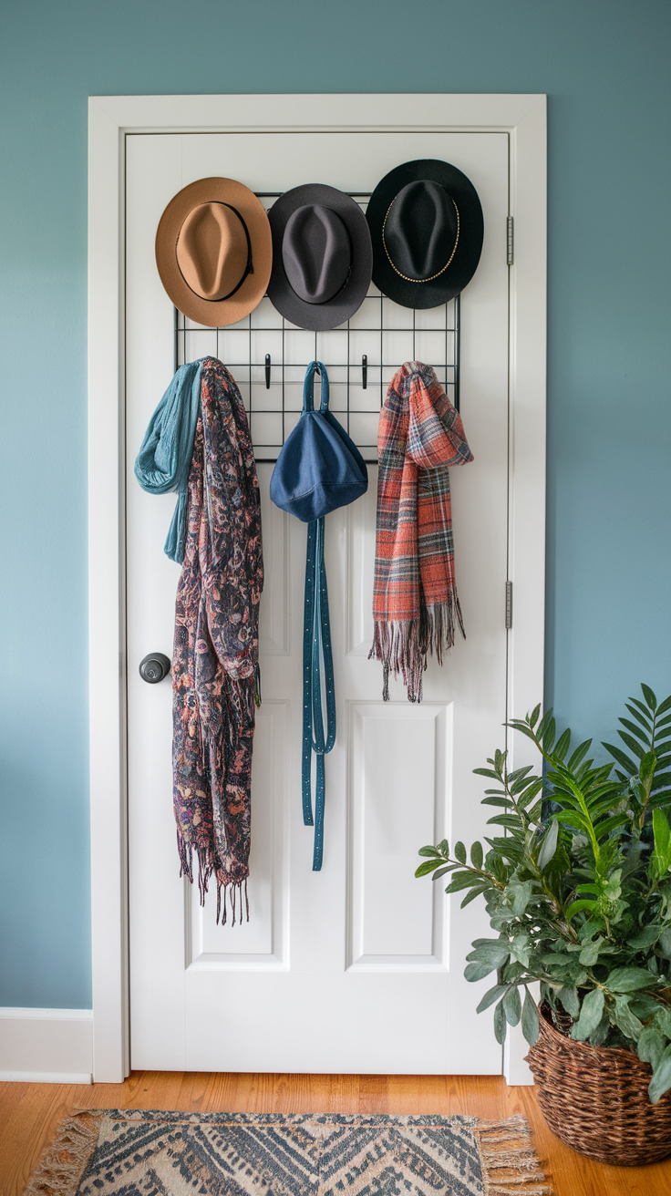 The back of your front door is basically wasted space unless you put it to work. Consider creating a drop zone on the back of the door for quick access to essentials like keys, bags, or mail.