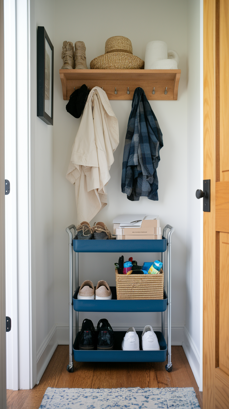 If your entryway doubles as a “multi-purpose zone,” roll with it—literally. A slim rolling cart can hold shoes, mail, or even dog-walking gear. Rolling carts are especially ideal for a small hallway or narrow hallway, where space is limited but organization is key. You can easily move the cart between rooms as needed. Need to clean? Just roll it out of the way. Easy.