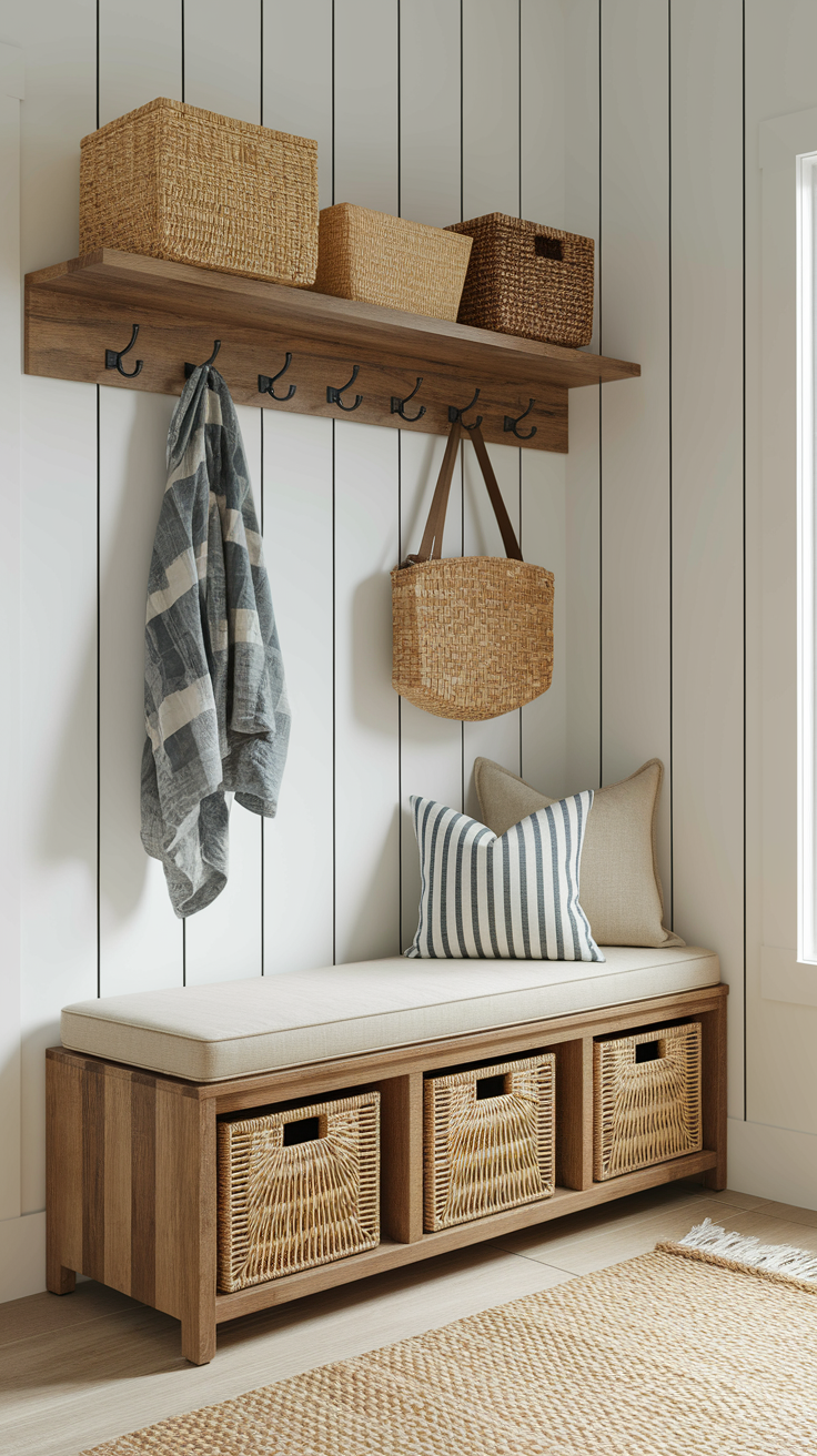 Open benches with baskets underneath keep things visible but tidy.