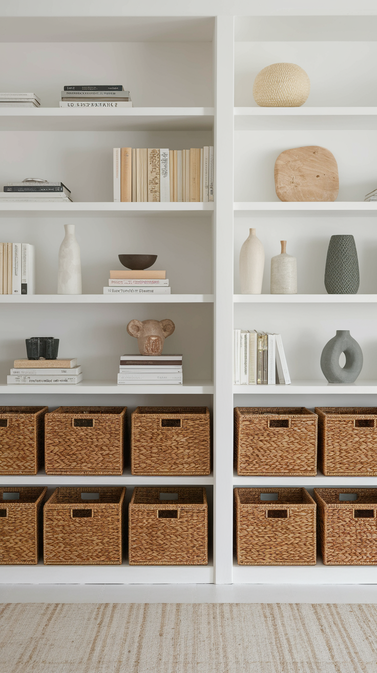 Use woven baskets for storage—cute and functional.
