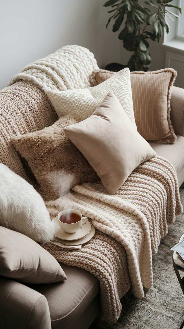 And don’t forget the cushions. Mix different fabrics and sizes—velvet, linen, or cable-knit. Keep your color palette calm with neutrals and pastels.
