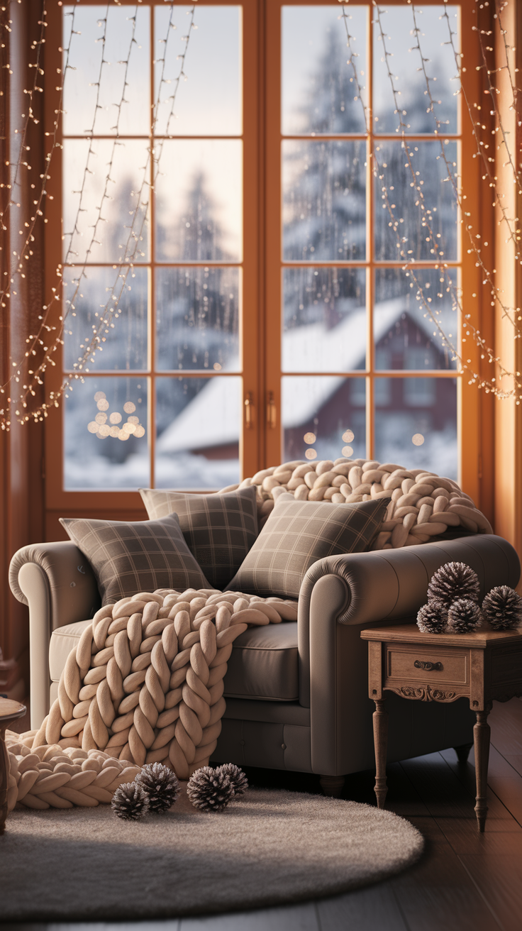 Add winter accents like chunky knit throws, faux fur pillows, and candles—these touches help transform your space into a true winter home.