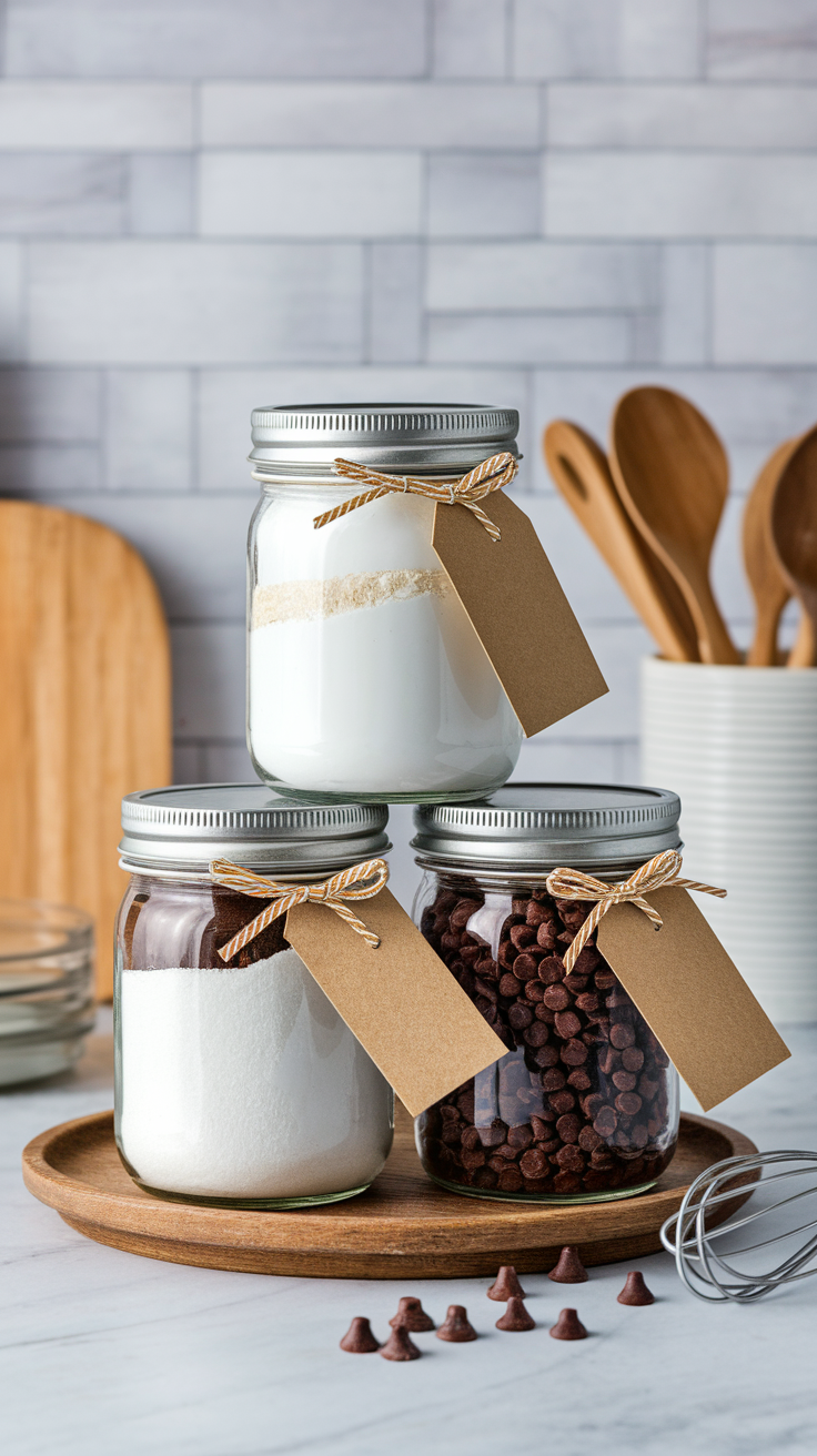 Layer dry ingredients in a mason jar (flour, sugar, cocoa, etc.)