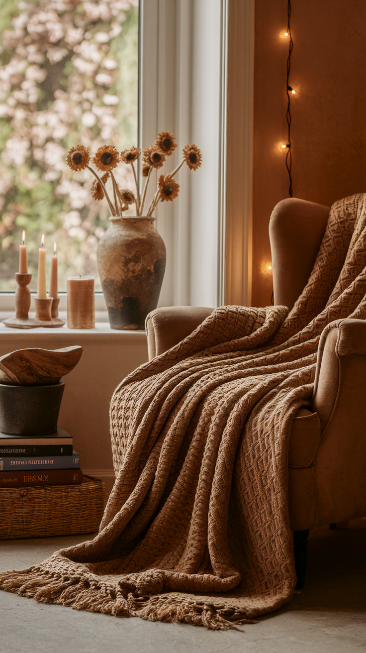 Swap lightweight décor for layered pieces—heavy throws, thick rugs, and soft lighting.