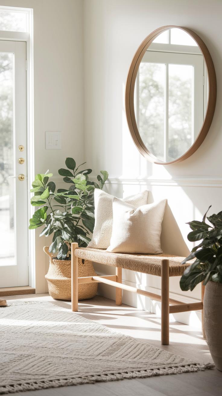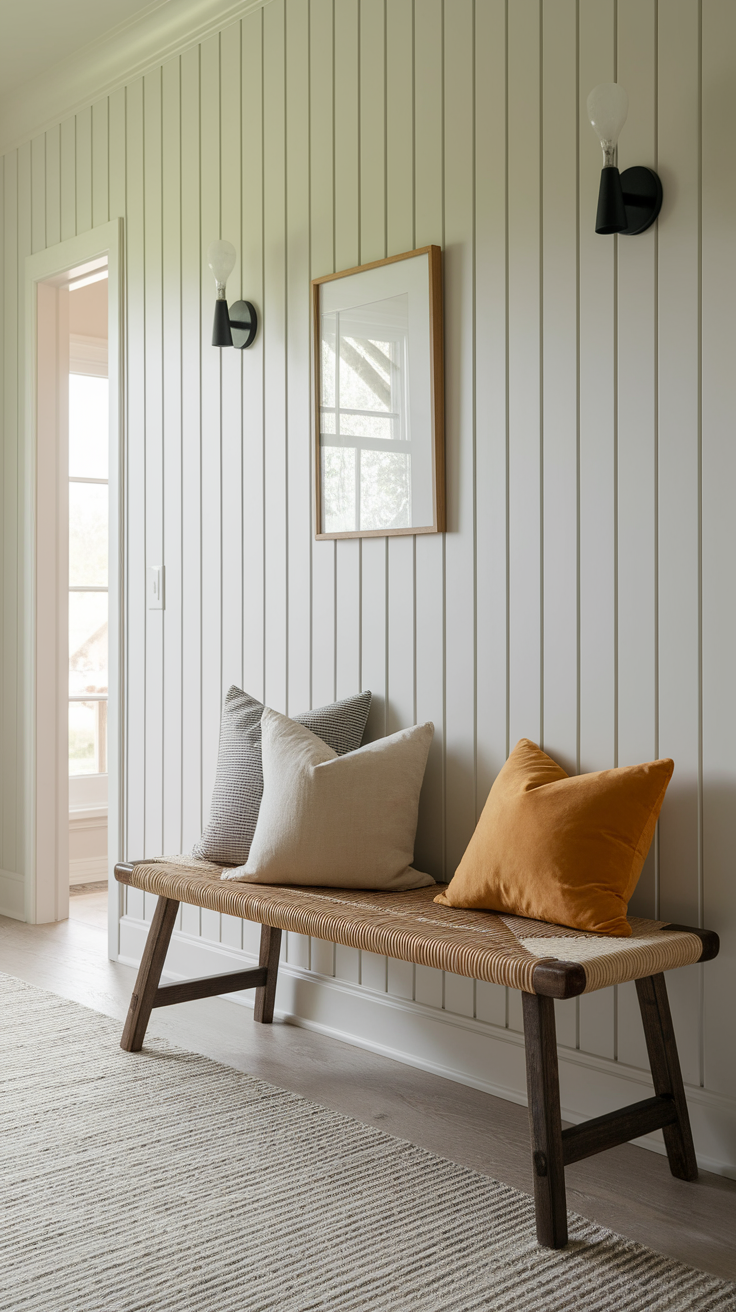 Personally, I love a big round mirror—it balances the horizontal bench with a vertical focal point. Plus, mirrors bounce light and make your entryway feel bigger. Win-win.