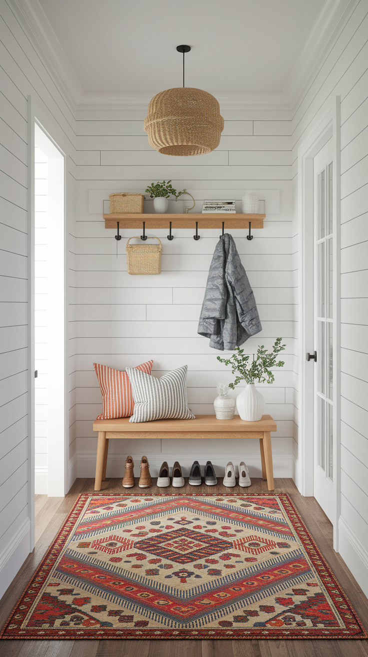 Ever noticed how a rug pulls a space together? Same goes here. Adding an area rug, runner, or small rug under your bench makes the whole area feel intentional instead of “random bench shoved against the wall.”