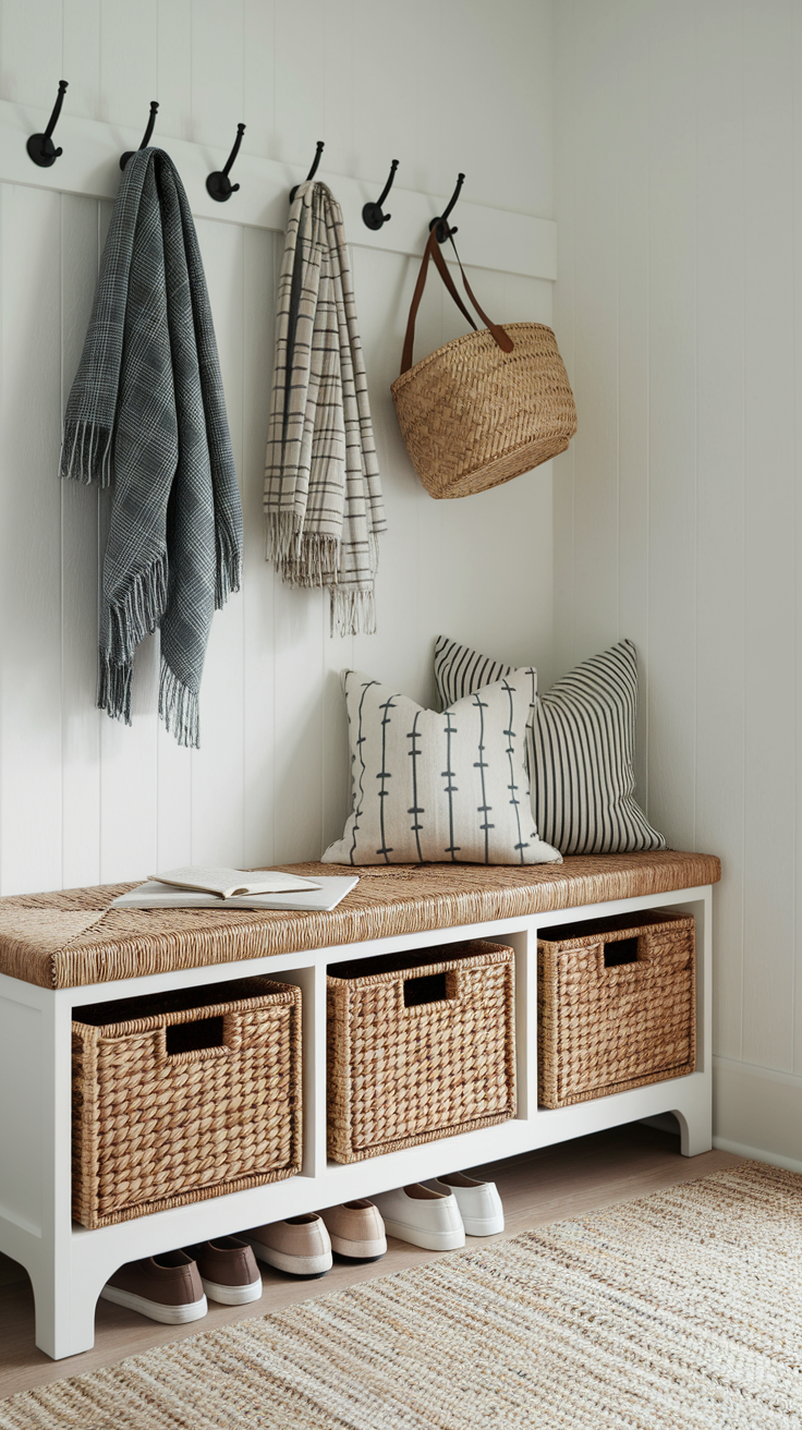 Layering pillows, adding a rug, and incorporating baskets under the bench instantly elevate both style and practicality.