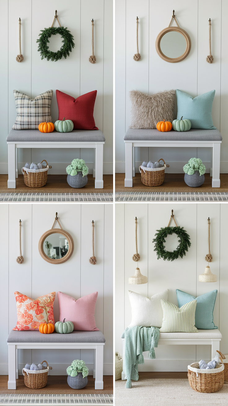 Seasonal refreshes and thoughtful wall decor help keep your entryway bench inviting and personalized year-round.