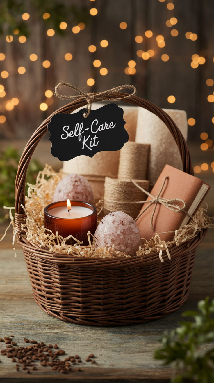 Self-Care Box: Affirmation cards, handmade lotion, herbal tea, and a journal.