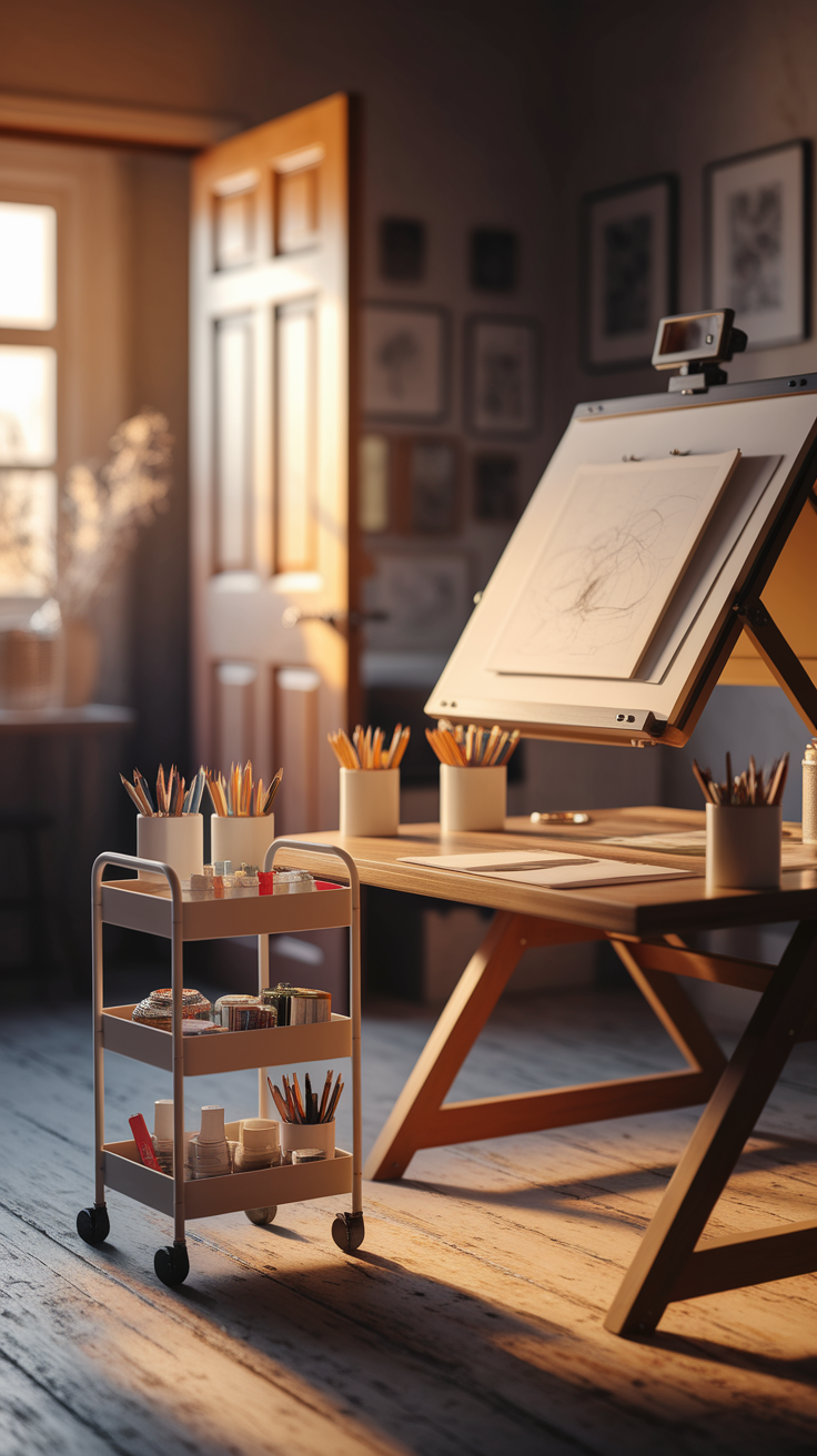 Artists often live in “organized chaos.” Help them out with cute storage options for pencils, pens, and brushes. IKEA carts, desktop drawers, or even aesthetic pen cups do wonders.
